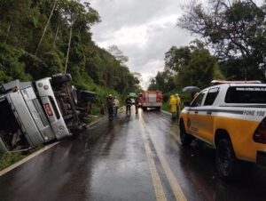 No momento, aguarda-se a chegada dos caminhões guincho para retirada do caminhão e liberação posterior da via.